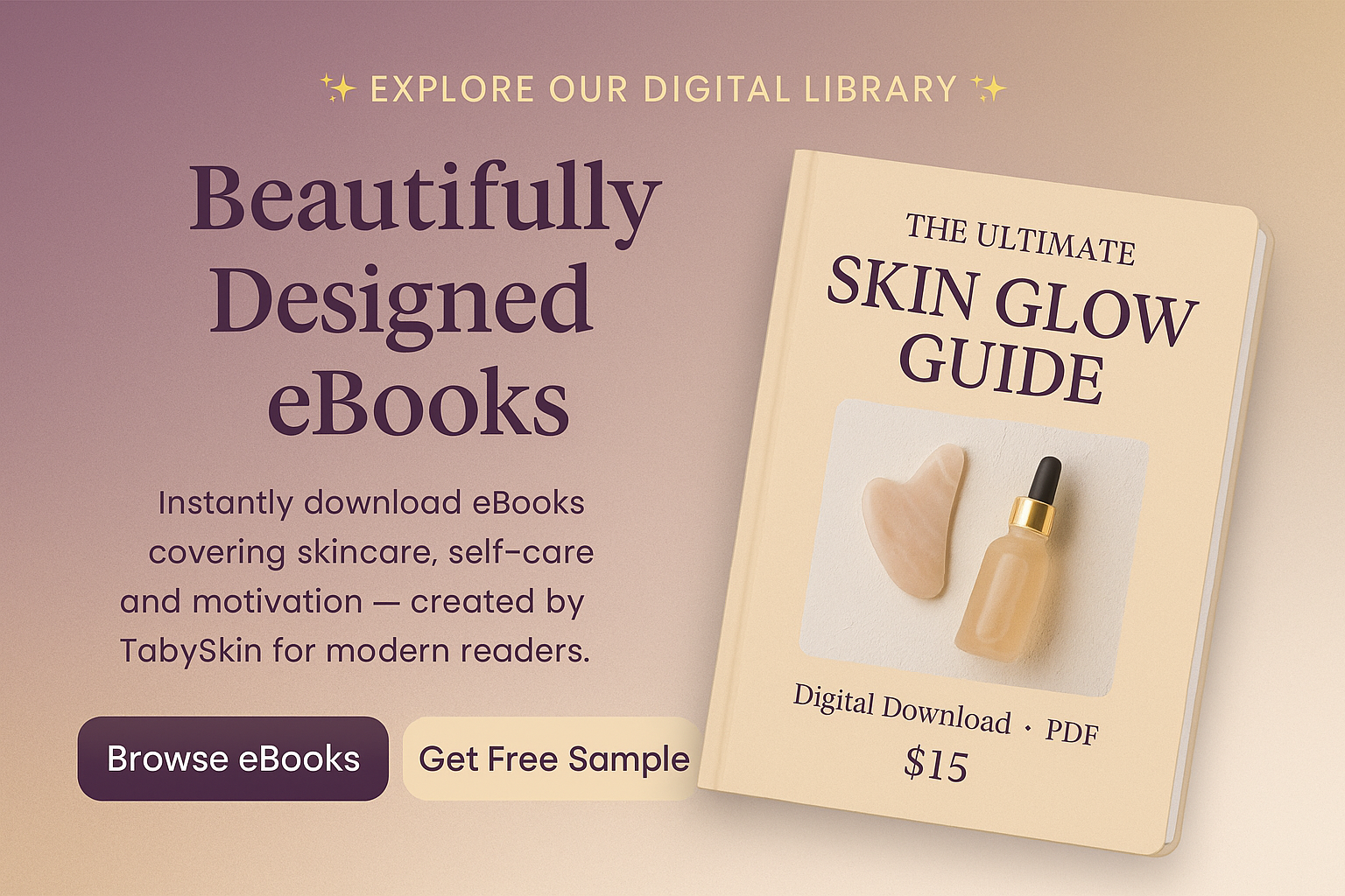 Instantly download beautifully designed eBooks covering skincare, self-care, and motivation — created by TabySkin for modern readers.